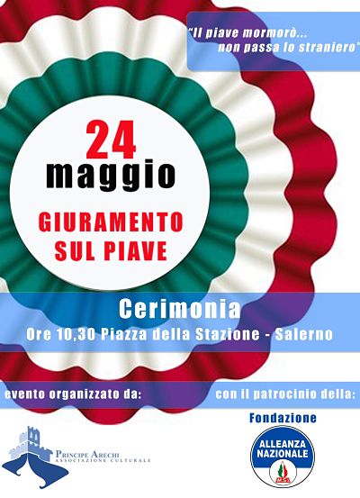 L’Associazione Principe Arechi rende noto agli organi d’informazione che ha organizzato, con il patrocinio della Fondazione Alleanza Nazionale, domenica 24 maggio 2015 alle ore 10:30 a Salerno in Piazza della Ferrovia un momento di ricordo e di riflessione per commemorare il centenario dell’entrata in guerra dell’Italia contro gli Imperi Centrali, segno di altissimo momento di amore per la Patria e per il Tricolore.