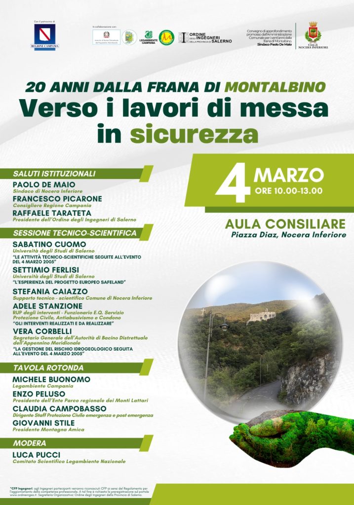Si svolgerà martedì 4 marzo, in Aula Consiliare, il convegno “Vent’anni dalla frana di Montalbino. Verso i lavori di messa in sicurezza”, per ricordare le vittime che persero la vita nel 2005 e approfondire gli interventi di messa in sicurezza riguardanti la zona pedemontana di Nocera Inferiore.