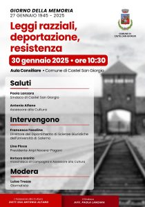 Giovedì 30 gennaio alle 10.30 in aula consiliare un convegno – dibattito su “Leggi razziali, deportazione, resistenza” con Francesco Fasolino, Direttore del Dipartimento di Scienze Giuridiche dell’Università di Salerno,