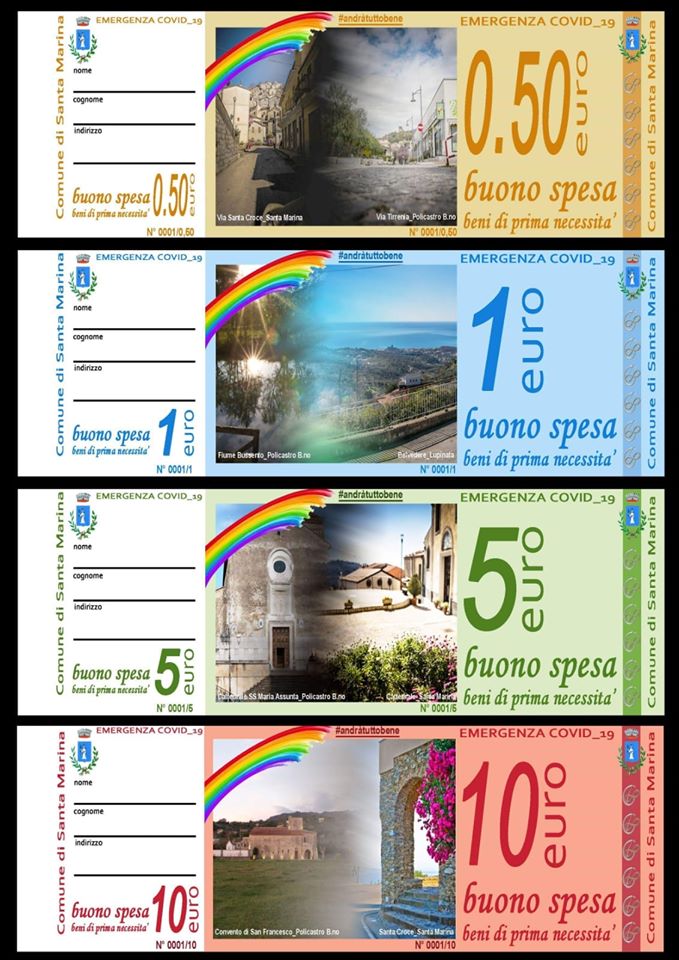 Questa moneta potrà essere utilizzata all’interno del comune e avrà la funzione dei classici buoni spesa. Ogni foto scelta su queste banconote rappresenta i posti più iconici di Santa Marina, Policastro e Lupinata. Uniti ne usciremo. Io Sindaco e tutta l’amministrazione vi é vicina e rinnovo ancora una volta l’appello di utilizzare i numeri preposti per qualsiasi problema e/o bisogno!