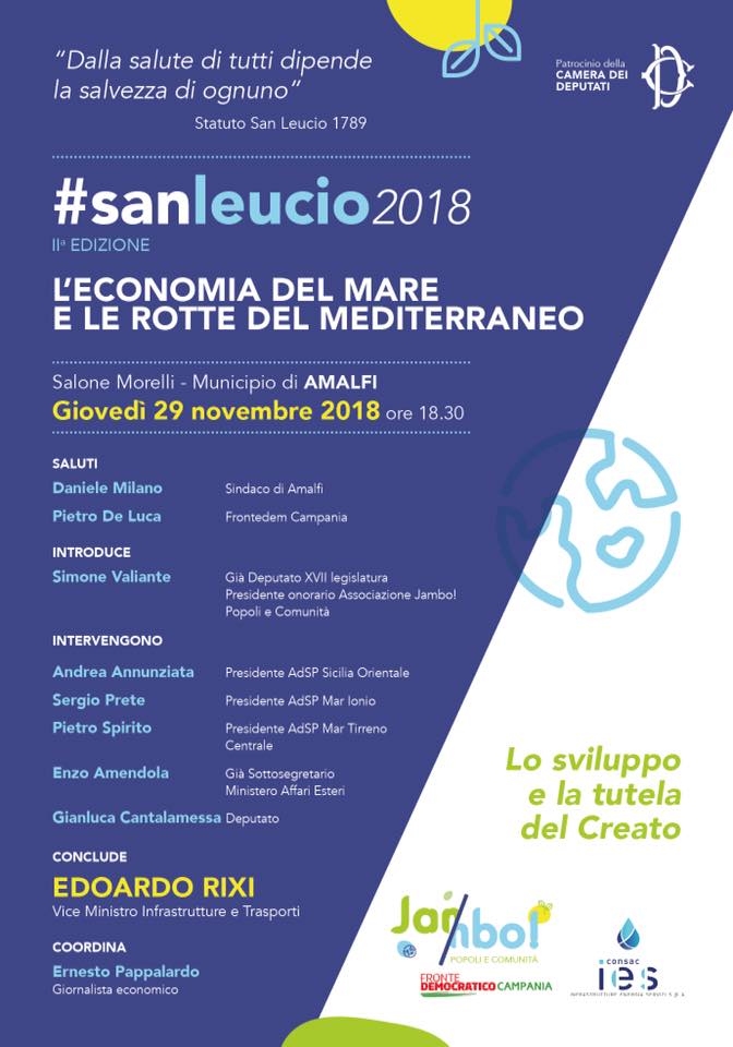 Dopo il successo dell’evento di Scafati, con la prestigiosa presenza del Ministro dell’Ambiente Sergio Costa, giovedi’ 29, a partire dalle 18:30, ad Amalfi, secondo appuntamento di San Leucio 2018, con un convegno dedicato all’economia del mare al quale prenderà parte, tra gli altri, il Vice Ministro alle Infrastrutture Edoardo Rixi.
