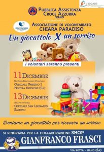 Tutto pronto per la distribuzione dei giocattoli nei reparti degli ospedali di Nocera e Salerno. Domani i nostri volontari faranno visita ai piccoli pazienti del reparto di oncologia presso l’ospedale “Umberto I” di Nocera in collaborazione con l’Associazione Chiara Paradiso. Crediamo fermamente che donare un sorriso molte volte è il miglior antidoto contro i momenti di sofferenza, noi ci proviamo.