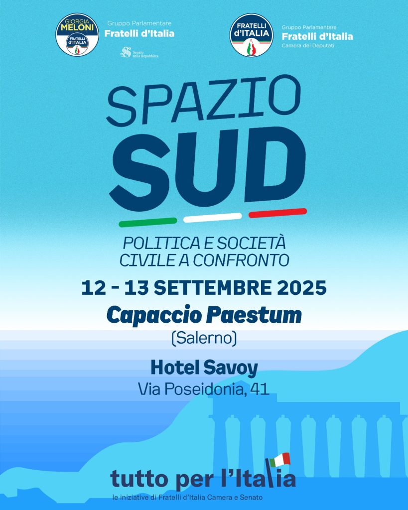 Sarà Paestum ad ospitare, dal 12 al 13 Settembre, l’evento Spazio Sud, organizzato dai Gruppi Parlamentari di Fratelli D’Italia: si tratta di una convention, suddivisa su due giorni ed in 7 panel, che porterà nel cuore del Cilento, non solo…