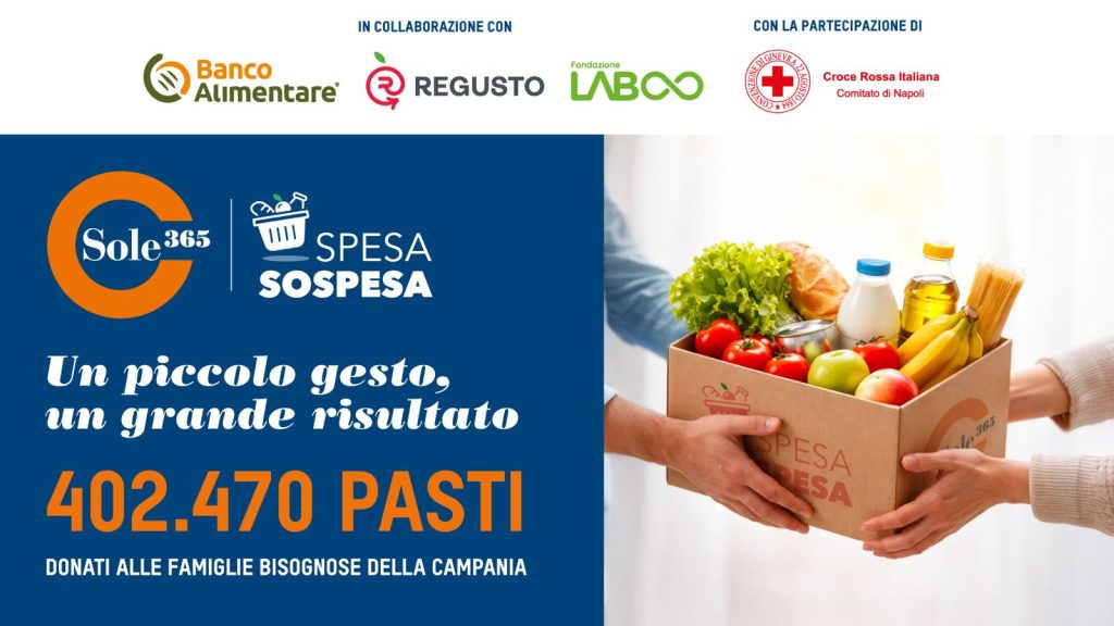 Si terrà Martedì 27 gennaio 2026, presso l’Auditorium del Banco Alimentare Campania a Mercato San Severino (SA) in Piazza don Luigi Giussani, la consegna simbolica dell’assegno da parte di Sole365 al progetto SpesaSospesa.org®, per 415.986 pasti donati.