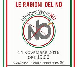 “Come è nostra abitudine ci mettiamo la faccia. Per illustrare le ragioni del No al Referendum per lunedì 14 Novembre con i nostri illustri ospiti spiegheremo ai cittadini di Baronissi i motivi per i quali è giusto scrivere No sulla scheda elettorale.” E’ quanto annuncia il consigliere comunale di Baronissi Gennaro Esposito che, insieme all’ex assessore Tony Siniscalco, ha organizzato, per lunedi’ 14 Novembre, a partire dalle 19:00, un incontro per discutere delle ragioni del No.