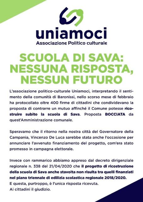 L’associazione politico-culturale Uniamoci, interpretando il sentimento della comunità di Baronissi, nello scorso mese di febbraio ha protocollato oltre 400 firme di cittadini che condividevano la proposta di contrarre un mutuo affinché il Comune potesse ricostruire subito la scuola di Sava. Proposta BOCCIATA da quest’Amministrazione comunale.