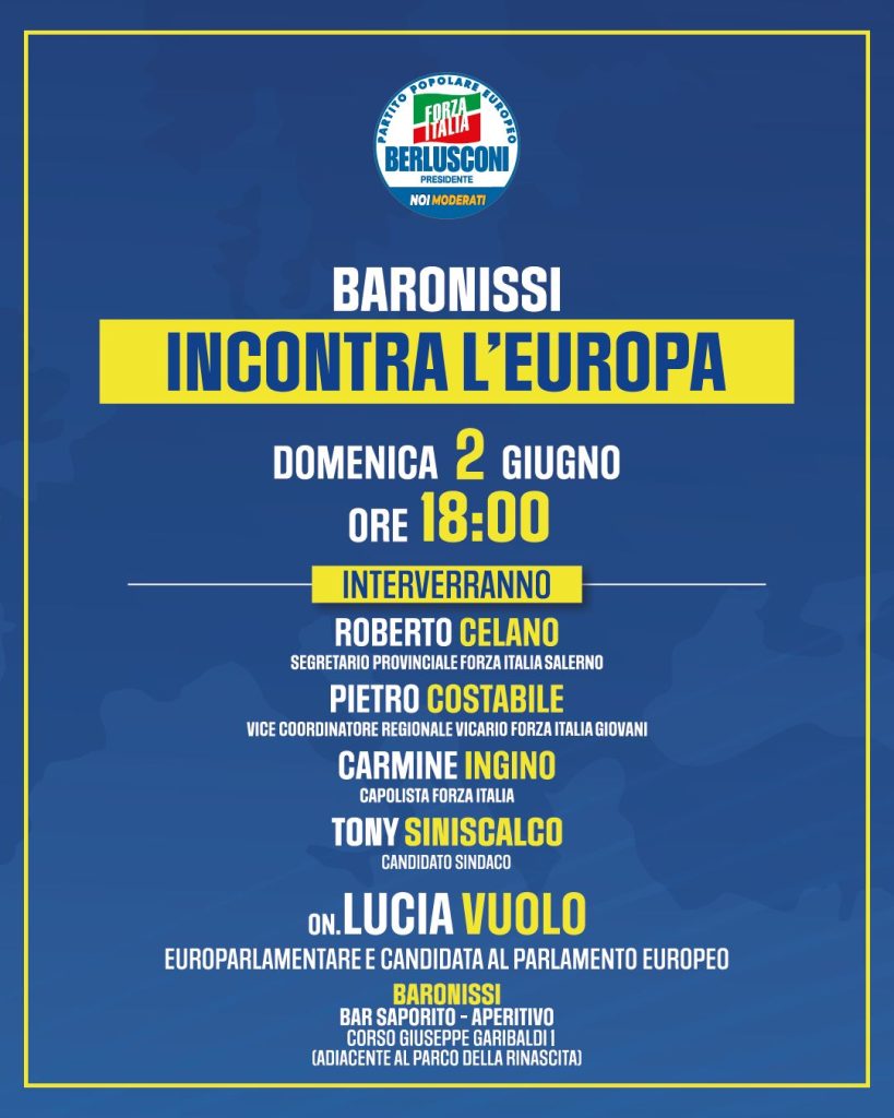 Lucia Vuolo, europarlamentare in carica e candidata alle prossime elezioni Europee con Forza Italia,  arriva a Baronissi, domenica 2 giugno, a partire dalle 18:00, per un incontro, organizzato da Forza Italia, per discutere ed affrontare i delicati temi delle opportunità offerte dall’Europa ai territori.