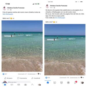 Prima ha postato una foto di una spiaggia con mare limpido e cristallino, presentandola come il litorale di Battipaglia, poi, quando si è resa conto del clamoroso errore (si trattava di una foto presa dal web e che ritraeva il mare del Salento), ha chiesto scusa. Il clamoroso scivolone del sindaco di Battipaglia Cecilia Francese ha scatenato l’ironia dei cittadini che, dopo aver visto la foto, hanno gridato al “miracolo”, parlando degli effetti taumaturgici che si scatenano dall’intervento del primo cittadino. Una semplice leggerezza ? Chi lo sa, sta di fatto che tra la pubblicazione della foto spacciata come quella della Litoranea e le scuse per aver utilizzato una foto del Salento sono passate diverse ore.