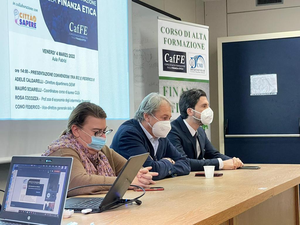 La convenzione, all’interno della quale la BCC Monte Pruno darà l’opportunità a tre giovani laureati di svolgere un tirocinio curriculare nell’istituto di credito cooperativo, è stata ufficializzata durante una sessione formativa del Corso di Alta Formazione sulla Finanza Etica, organizzato dal Dipartimento di Economia, Management, Istituzioni dell’Università Federico II. Lezione, svoltasi presso il Complesso Universitario di Monte Sant’Angelo a Napoli, nella quale è salito in cattedra il Vice-Direttore Generale della Banca Monte Pruno Cono Federico che ha tenuto un intervento dal titolo “L’operatività del credito cooperativo tra sostenibilità ed imprenditorialità: esperienza, prassi e prospettive”.