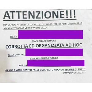 Questo fatto va ad aggiungersi all’esposto inviato, nelle settimane scorse, alla Procura della Repubblica, presso il tribunale di Salerno, da parte di un dipendente comunale. L’esposto segnalava eventuali anomalie nella procedura selettiva per la scelta di un funzionario di Elevata Qualificazione.”
