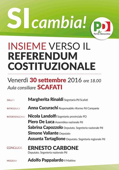 SCAFATI. IL PD PER IL SI AL REFERENDUM: INCONTRO-DIBATTITO CON PIERO DE LUCA IL 30 SETTEMBRE