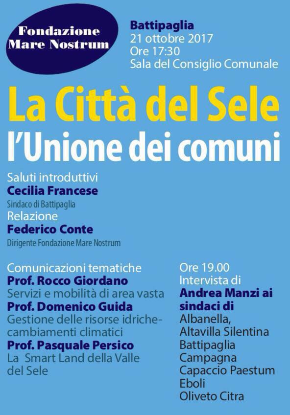 Organizzato dalla Fondazione Mare Nostrum, il convegno in programma Sabato 21 Ottobre, alle 17:30, a Battipaglia, all’interno della Sala del Consiglio Comunale, sarà l’occasione per discutere della Città del Sele e dell’Unione dei Comuni. Share on: WhatsApp