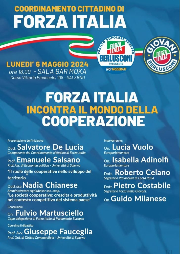SALERNO. FORZA ITALIA INCONTRA IL MONDO DELLE COOPERATIVE: APPUNTAMENTO DOMANI 6 MAGGIO