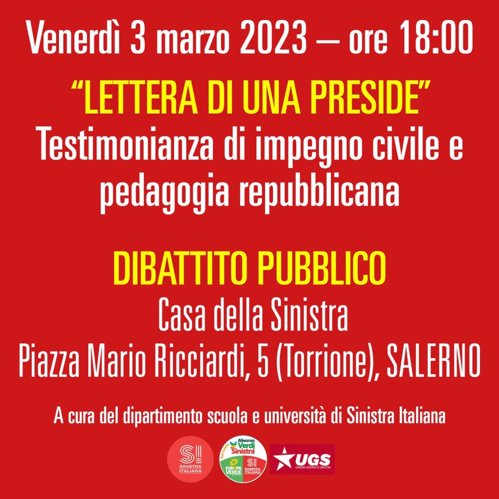 L’appuntamento è per domani, venerdi’ 3 Marzo, all’interno della sede della Casa della Sinistra di Salerno, a Torrione, a partire dalle 18:00: al centro di un dibattito, di natura chiaramente politica, la vicenda della lettera della Preside di Firenze, originaria…