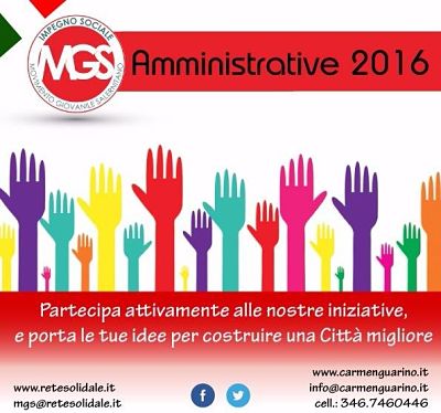 Fino al prossimo 17 Dicembre, data fissata per la nuova assemblea provinciale di MGS Impegno Sociale, ci saranno incontri e riunioni per comprendere quali dei candidati in campo, nei diversi comuni, presenta un programma che sia aderente alla necessità di intervenire in favore della fasce piu’ deboli della società. Un vero e proprio screening dei progetti in campo prima di stabilire alleanze ed accordi in vista delle comunali della primavera del 2016.
