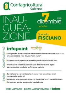Realizzato in collaborazione con Confagricoltura Salerno lo spazio, posizionato al piano terra del Municipio, avrà lo scopo di accogliere e informare le imprese e i cittadini sulle opportunità di sviluppo messe a disposizione del territorio. Divulgare le iniziative legate ai bandi della misura 19 del PSR 2014-2020 emanati dal GAL Terra è Vita; fornire supporto tecnico per tutte le realtà agricole della Valle dell’Irno; ricevere informazioni costanti sulle evoluzioni delle normative legate a una corretta conduzione d’impresa agricola.
