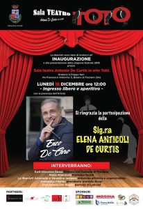 Il 18 Dicembre presso l’oratorio San Filippo Neri sito in Bolano in via Francesco Ardovino n 3 sarà inaugurata la Sala teatro “ Antonio De Curtis” in arte Totò : un sogno che diventa realtà.
