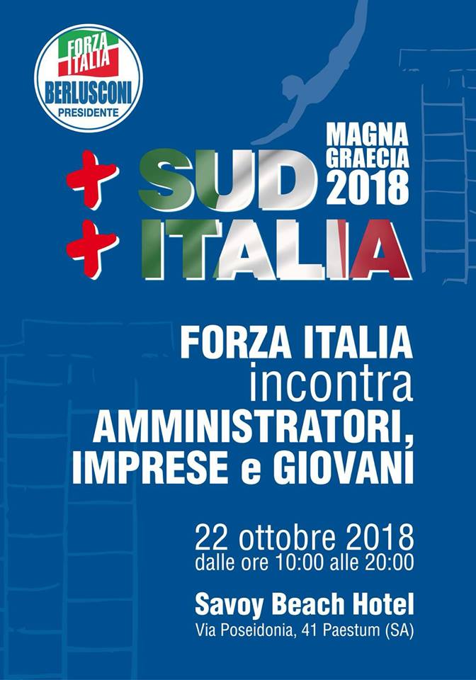 Piu’ Sud, Piu’ Italia: è questo il tema dell’evento che Forza Italia ha organizzato a Paestum per lunedi’ 22 Ottobre quando i vertici provinciali del partito degli azzurri, all’interno dei saloni del Savoy Beach Hotel di Paestum, incontreranno gli amministratori della provincia di Salerno, le imprese ed i giovani. Un appuntamento che arriverà a poco meno di 10 giorni dalle elezioni provinciali: per Forza Italia inizia la stagione delle comunali con i tanti comuni del salernitano chiamati alle urne nel prossimo mese di maggio.