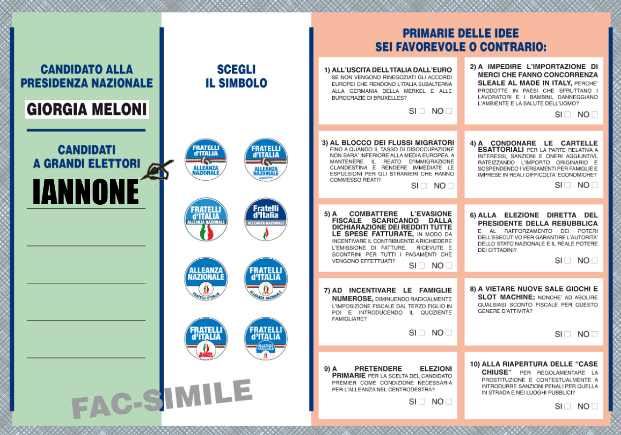 Gli elettori, pagando un euro, avranno diritto a scegliere il simbolo del partito da presentare alle Europee, i punti del programma (tra cui figura anche l’abolizione della Legge Merlin, con la riapertura delle Case Chiuse), i membri della direzione nazionale indicando 5 nomi tra i candidati.
