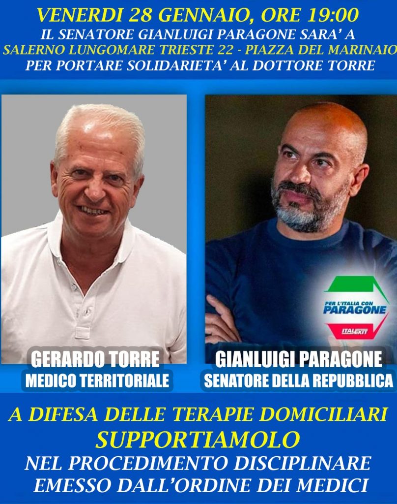 Il Senatore Gianluigi Paragone, leader del movimento Italexit, arriva a Salerno per difendere il dottore Gerardo Torre, medico finito al centro di un procedimento disciplinare dell’Ordine dei Medici, per aver praticato, durante i mesi scorsi, terapie domiciliari ai malati affetti da Covid. L’arrivo di Paragone, impegnato in un tour nazionale proprio in questi giorni per dire No alle politiche del Governo sul Green Pass e sull’obbligo di vaccinazione, giunge dopo che anche altri esponenti politici, a cominciare dal Sindaco di Pagani Lello De Prisco, hanno espresso solidarietà al medico Torre. L’appuntamento con Gianluigi Paragone è per venerdì a partire dalle 19:00 a Salerno, nei pressi di Piazza del Marinaio sul Lungomare Trieste.