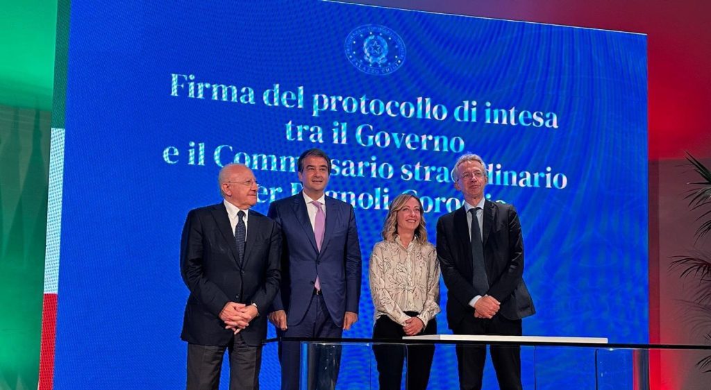 “Presidente vieni a fare la foto, vieni a fare una foto con noi”. La presidente del Consiglio Giorgia Meloni invita così il presidente della Regione Campania Vincenzo De Luca sul palco dell’auditorium di Porta del Parco a Bagnoli dove si è recata a sottoscrivere il protocollo d’intesa per il risanamento e rilancio dell’area. “Facciamo una foto insieme presidente”, si aggiunge il ministro per gli affari europei, le politiche di COESIONE e il PNRR Raffaele Fitto. Il Sindaco di Napoli Gaetano Manfredi sta mostrando la rappresentazione grafica “dell’opera di arte contemporanea che illuminerà il sito dei ‘Sei bicchieri’, che era la centrale di raffreddamento dell’Ilva e che ora e diventata un centro di ricerca dell’Anton Dohrn”, nota stazione zoologica e oceanografica di Napoli. Anche così però De Luca non pare entusiasta della photo opportunity, e quindi Meloni lo incalza: “è un po’ di arte, mica…” Allora Fitto prova a convincerlo: “siamo al lavoro presidente”, e dunque “facciamo la foto…”, concede infine De Luca allargando le braccia.