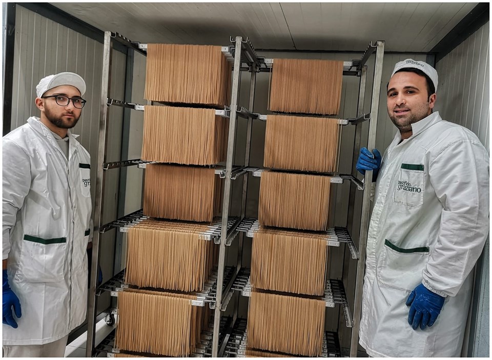 La pasta integrale del Pastificio Graziano di Manocalzati segue scrupolosamente il metodo di lavorazione degli storici artigiani di Gragnano: trafilatura al bronzo e lenta essiccazione statica su telai per almeno due giorni a bassa temperatura.