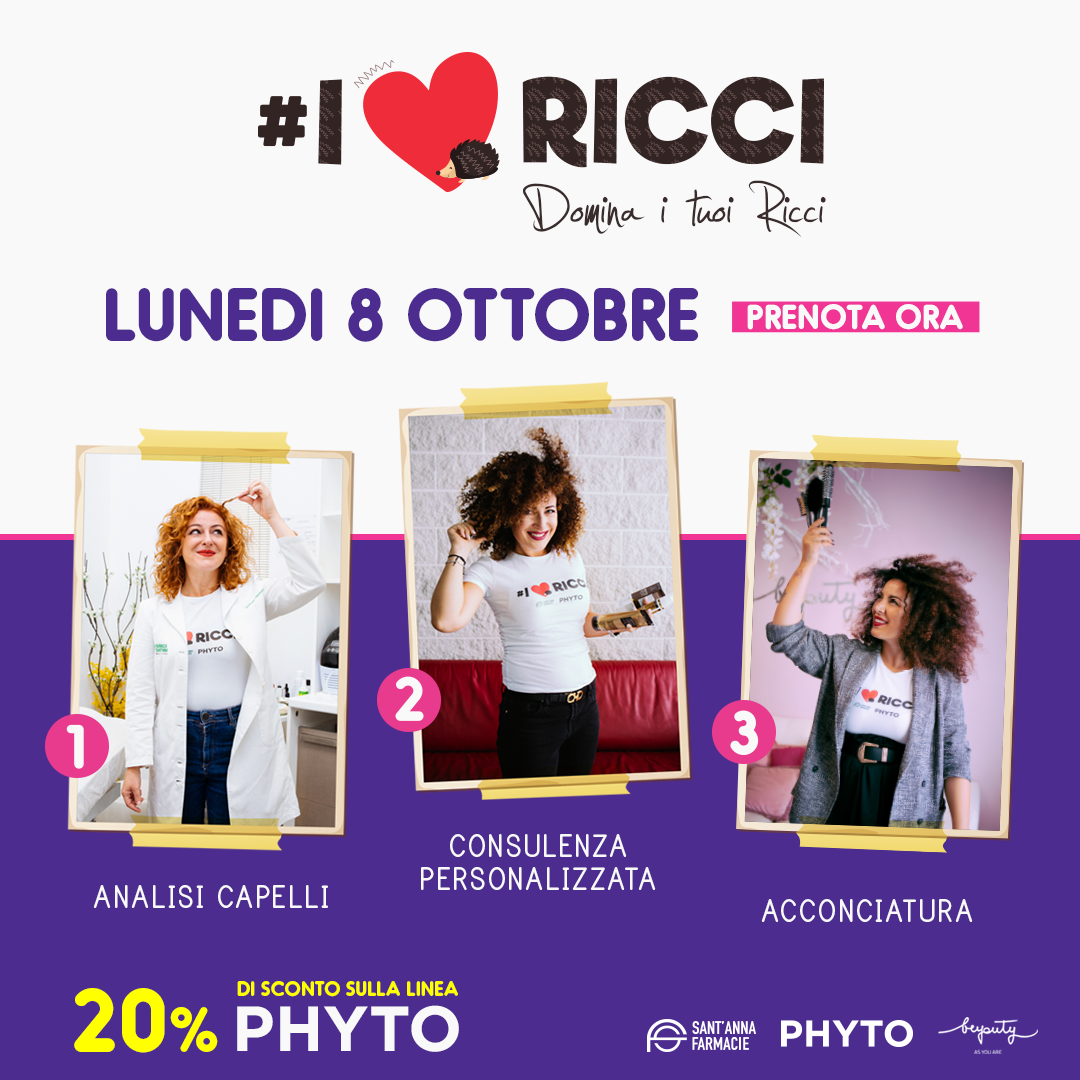 I Love Ricci è l’evento che animerà la Farmacia Sant’Anna di Bellizzi lunedì 8 ottobre. Organizzato in collaborazione con Phyto, I Love Ricci trasformerà la farmacia in un salone di benessere e bellezza del capello. L’appuntamento è ovviamente dedicato a tutte le ricce, che avranno l’opportunità di seguire un vero e proprio percorso che darà nuova luce e brillantezza alla loro chioma. Con un finale a sorpresa che lascerà senza fiato.
