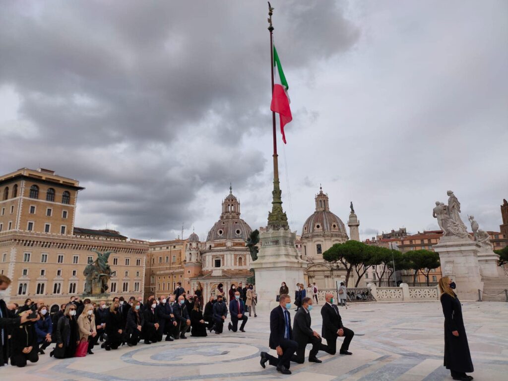 Guidati dalla leader Giorgia Meloni, i parlamentari di Fratelli d’Italia, questa mattina, hanno tenuto una cerimonia del tutto particolare, proprio nel giorno del 4 Novembre – ricorrenza della Forze Armate ed anche del Milite Ignoto: tutti insieme, in ginocchio sui gradini che portano all’Altare della Patria a Roma.