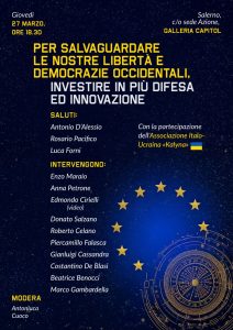 Giovedì 27 marzo alle 18.30, presso la Galleria Capitol di Salerno negli spazi di Azione, ci sarà un incontro pubblico che vedrà la partecipazione della associazione italo ucraina ‘Kalyna’ e di numerose personalità del mondo politico, accademico ed imprenditoriale, anche con sensibilità differenti ma chiare sui temi fondamentali in difesa delle libertà e futuro comune europeo. Ci saranno i saluti di Antonio D’Alessio, Rosario Pacifico e Luca Forni a cui seguiranno gli interventi di Enzo Maraio, Anna Petrone, Edmondo Cirielli in video, Donato Salzano, Roberto Celano, Piercamillo Falasca, Gianluigi Cassandra, Costantino De Blasi, Beatrice Benocci con la partecipazione della associazione italo-ucraina ‘Kalyna’ ed Antonluca Cuoco a moderare.