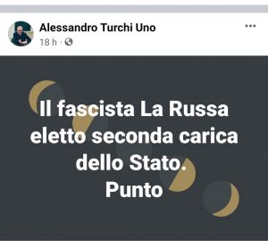 Un Preside, un Dirigente scolastico che, dal suo profilo Fb, definisce “fascista” Ignazio La Russa, da ieri Presidente del Senato della Repubblica, seconda carica dello Stato. A sollevare il caso, pubblicando il post del Preside in questione, è il Senatore Antonio Iannone di Fratelli d’Italia.