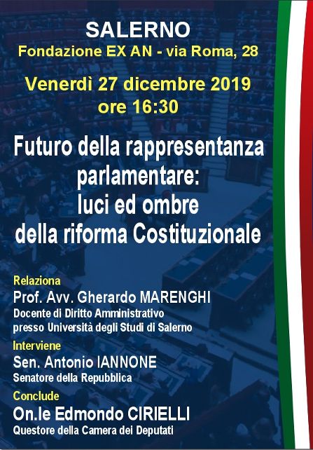 Interverranno il professore Gherardo Marenghi (docente di Diritto Amministrativo presso l’Università degli Studi di Salerno); il senatore Antonio Iannone e l’onorevole Edmondo Cirielli (Questore della Camera dei Deputati). Al termine della discussione, ci sarà un brindisi augurale di buon anno.