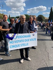 Il dimostrante, un anziano dal volto dolce e dallo sguardo fiero, ha chiesto pubblicamente perdono a Dio per aver votato due volte il M5s. Un modo simpatico e per nulla violento per esprime il proprio disappunto verso i pentastellati a cui in passato ha dato fiducia rimanendo, però, deluso. In pochissimo tempo, il manifestante è divenuto una sorta di simbolo della protesta contro il governo giallorosso.