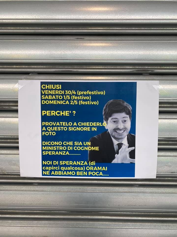 I Centri Commerciali, anche quelli con spazi all’aperto e dimensioni ridotte, sono stati completamente dimenticati dal Governo nell’ambito di una possibile riapertura: per loro rimangono i limiti ed i vincoli, soprattutto nel corso dei fine settimana come anche per i giorni prefestivi. Ecco allora che un imprenditore del settore del Commercio, oggi, dinanzi alla saracinesca del negozio, tristemente abbassata, ha voluto lanciare un messaggio chiaro al Ministro della Salute Roberto Speranza.
