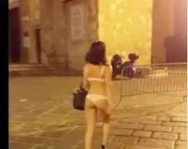 Coperta solo da biancheria intima, con borsa e tacchi a spillo a farle da accessori, la sexy star ha attraversato Corso Trieste sotto gli sguardi attoniti delle famiglie ancora a passeggio e quelli divertiti di giovani increduli per il singolare fuoriprogramma.