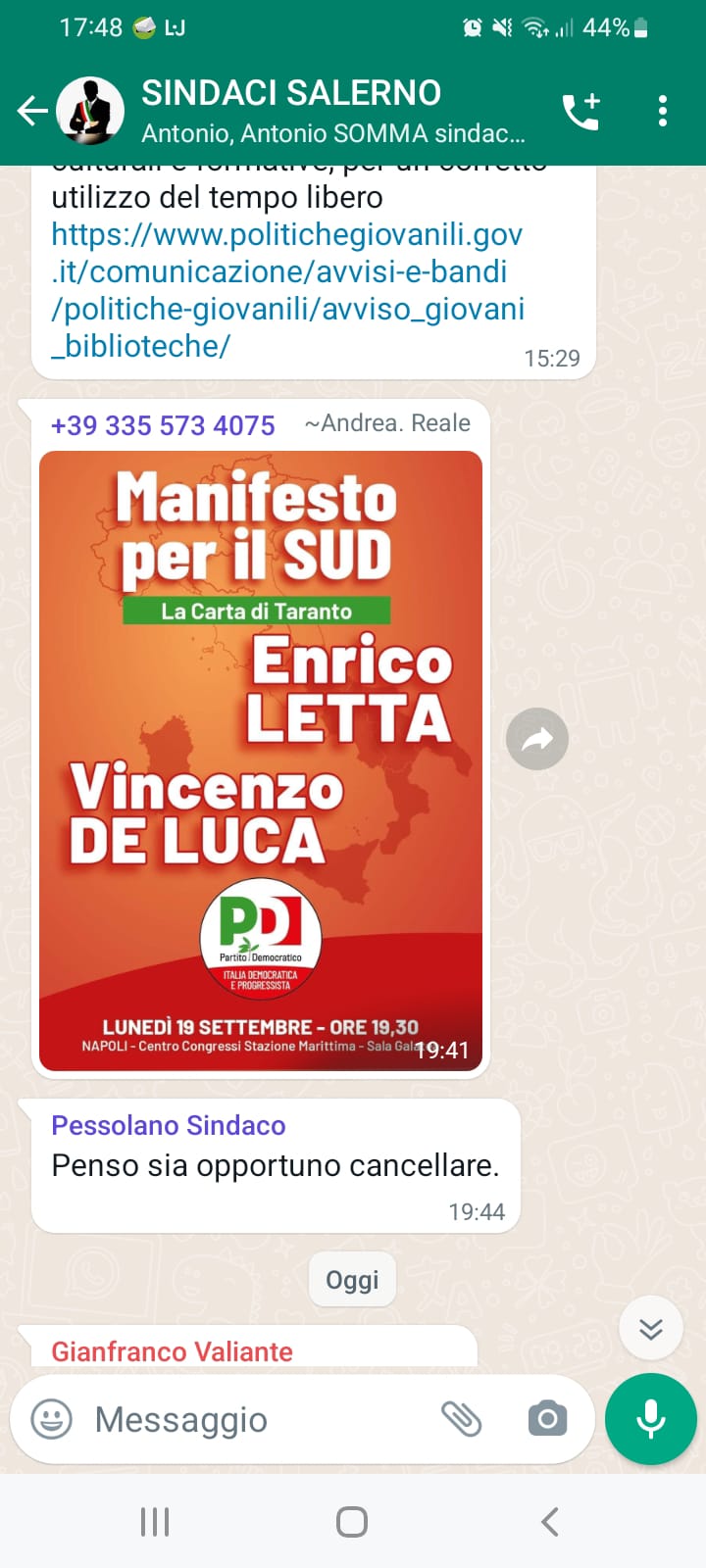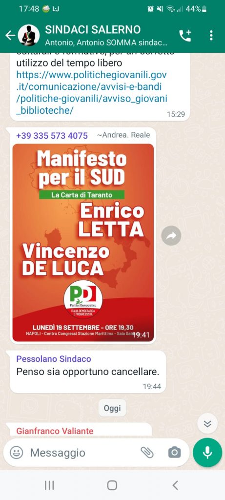 L’Anci tifa per il Pd ? L’Associazione Nazionale dei Comuni d’Italia tende a sinistra ? Pare proprio di si, considerato che la locandina per l’evento di lunedi’ 19 Settembre a Napoli, tra il Presidente della Regione Vincenzo De Luca ed il Segretario Nazionale del Pd Enrico Letta, è finita nella chat dei sindaci della Provincia di Salerno che aderiscono all’Anci. Un semplice errore ? Chi lo sa, sta di fatto che alcuni sindaci della Provincia di Salerno, rappresentanti del centro destra, hanno chiesto agli amministratori del Gruppo di rimuovere la locandina che, ovviamente, non ha nulla di istituzionale ma è solo una manifestazione di una parte politica, il Partito Democratico.