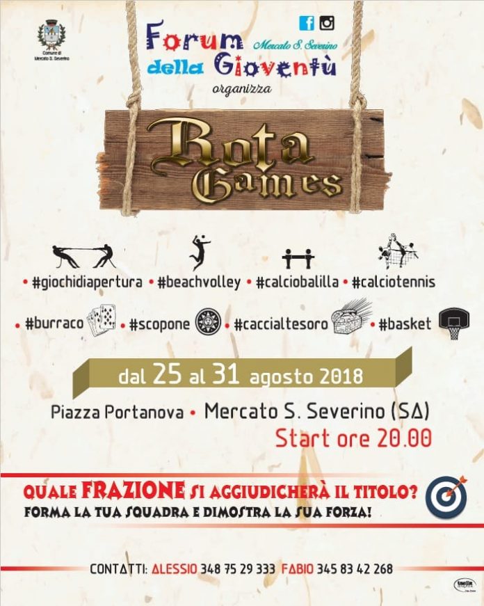 Nella cornice di piazza Portanova, dal 25 al 31 agosto, i giovani sanseverinesi, dai 15 anni in su, si incontrano, fraternizzano e gareggiano nella seconda edizione di Rotagames, evento organizzato e promosso dal Forum dei giovani di Mercato S. Severino, con il patrocinio dell’Amministrazione Comunale e con numerose novità rispetto allo scorso anno.
