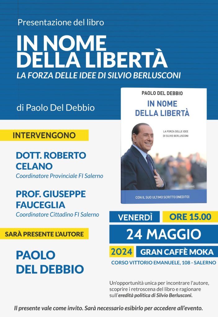 Il noto giornalista Paolo Del Debbio venerdi’ 24 Maggio, a partire dalle 15.00, all’interno dei saloni del Bar Moka di Salerno, presenterà il suo libro IN NOME DELLA LIBERTA’, dedicato alle idee politiche di Silvio Berlusconi. L’incontro, al quale si potrà accedere solo ad inviti, vedrà la partecipazione del Coordinatore Provinciale di Forza Italia Salerno Roberto Celano e del Coordinatore Cittadino del partito degli Azzurri Giuseppe Fauceglia.