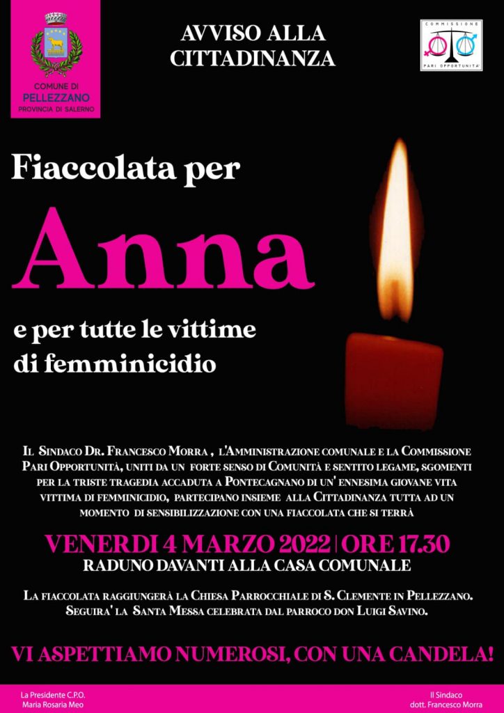 Fiaccolata per Anna. Ad organizzarla è il Sindaco di Pellezzano, dott. Francesco Morra, che insieme all’Amministrazione Comunale, alla Commissione Pari Opportunità, uniti da un forte senso di Comunità e sentito legame, sgomenti per la triste tragedia accaduta a Pontecagnano di un’ennesima giovane vita vittima di femminicidio, parteciperanno, con tutta la Cittadinanza ad un momento di sensibilizzazione con una fiaccolata che si terrà domani Venerdì 4 Marzo 2022, alle ore 17.30.