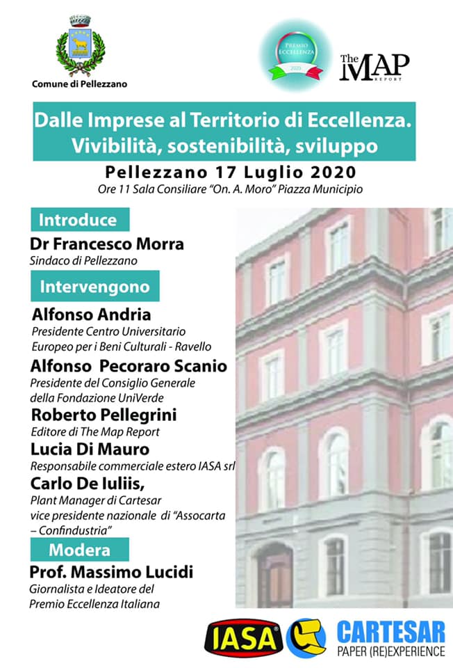 Interverranno: Alfonso Andria, Presidente del Centro Universitario Europeo per i Beni Culturali – Ravello; Alfonso Pecoraro Scanio, Presidente del Consiglio Generale della Fondazione “UniVerde”; Roberto Pellegrini, Editore di “The Map Report”; Lucia di Mauro, responsabile commerciale estero dell’azienda “IASA srl”; Carlo de Iuliis, Plant Manager di Cartesar, vicepresidente Nazionale di “Assocarta Confindustria”. Il dibattito verrà moderato dal prof. Massimo Lucidi, giornalista e ideatore del “Premio Eccellenza Italiana”.