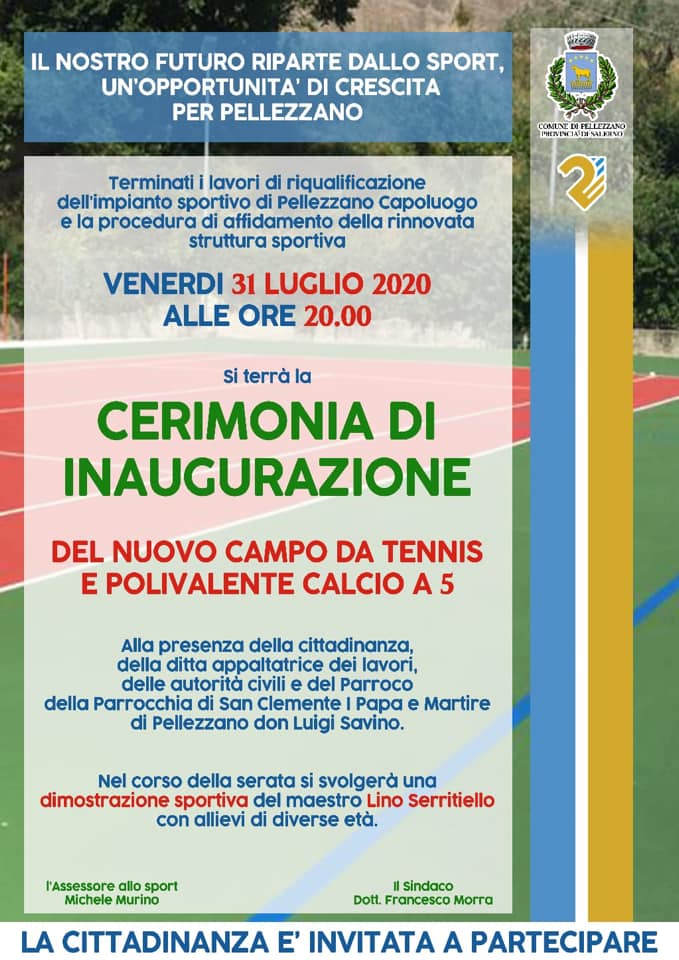 Venerdì 31 Luglio, alle ore 20.00, alla presenza del Sindaco di Pellezzano, dott. Francesco Morra e del Vicesindaco con delega allo Sport Michele Murino, a Pellezzano Capoluogo si terrà la cerimonia di inaugurazione del nuovo campo da tennis e polivalente calcio a 5.