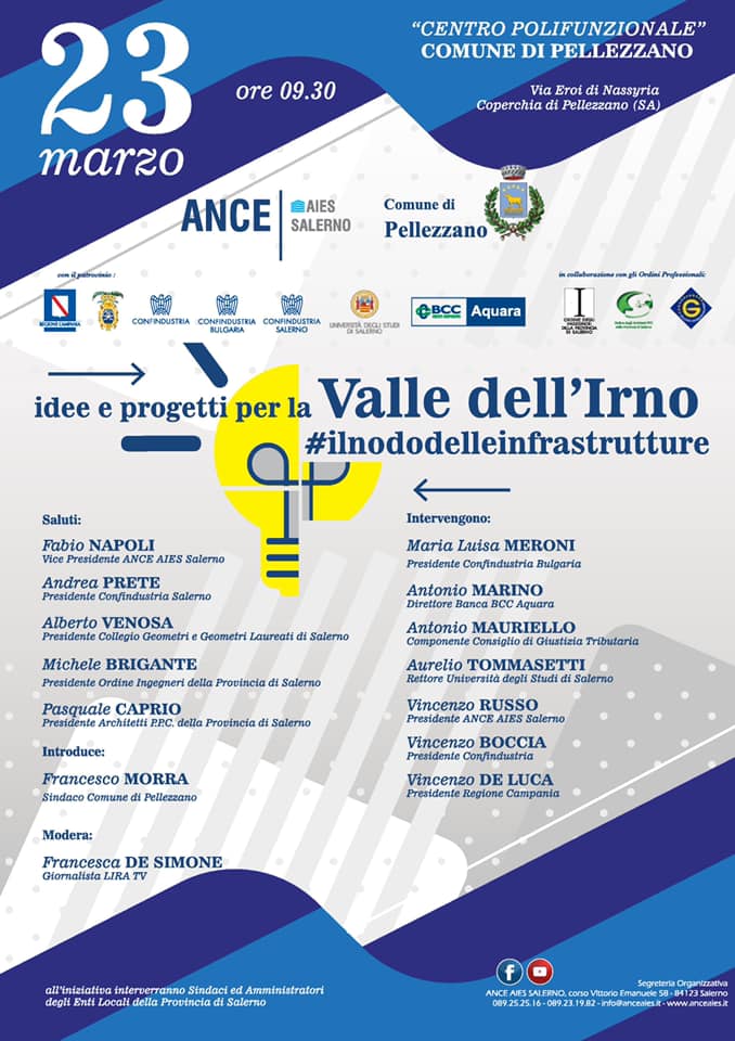 Ance Aies Salerno, d’intesa con il Comune di Pellezzano, ha programmato per Sabato 23 marzo 2019, presso il Centro polifunzionale del Comune di Pellezzano, il Convegno “Idee e progetti per la Valle dell’Irno”. Scopo dell’incontro è un confronto tecnico-amministrativo con la Regione Campania, Confindustria, l’Università e gli Ordini Professionali sui progetti, iniziative e attività da sviluppare per il rilancio di un territorio, il tutto in ambito di Area Vasta, quale la Valle dell’Irno, ove Infrastrutture, Riqualificazione Urbana, Università costituiscono gli assi portanti di rilancio del Territorio.