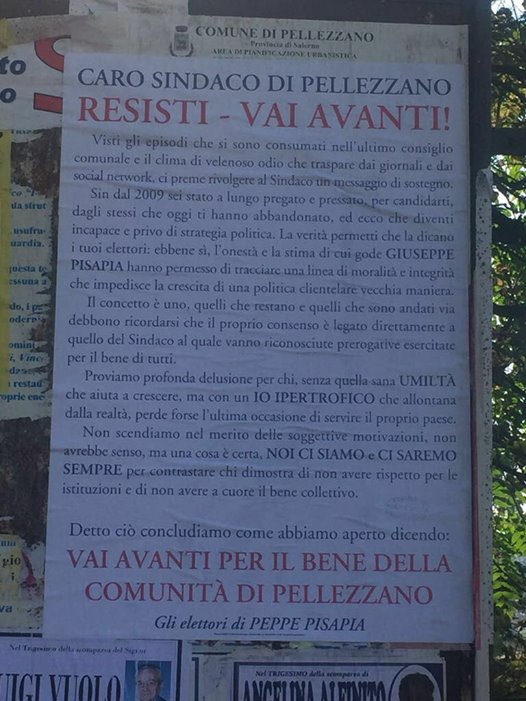 Eccolo il manifesto che, come anticipato da agendapolitica.it, i sostenitori del Sindaco di Pellezzano Giuseppe Pisapia hanno preparato per invitare il primo cittadino ad andare avanti, nonostante la grave crisi politica. Un testo nel quale si ripercorrono gli ultimi 3 anni a Palazzo di Città ma la firma è generica, anonima: i sostenitori del Sindaco Pisapia. Neppure i consiglieri e gli assessori hanno sottoscritto il documento ?