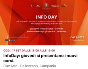 Il Comune di Pellezzano, in collaborazione con il team di CartArte ha organizzato un “INFO DAY” a pochi giorni dalla partenza dei 3 percorsi formativi dedicati all’inserimento lavorativo e alla creazione di impresa.