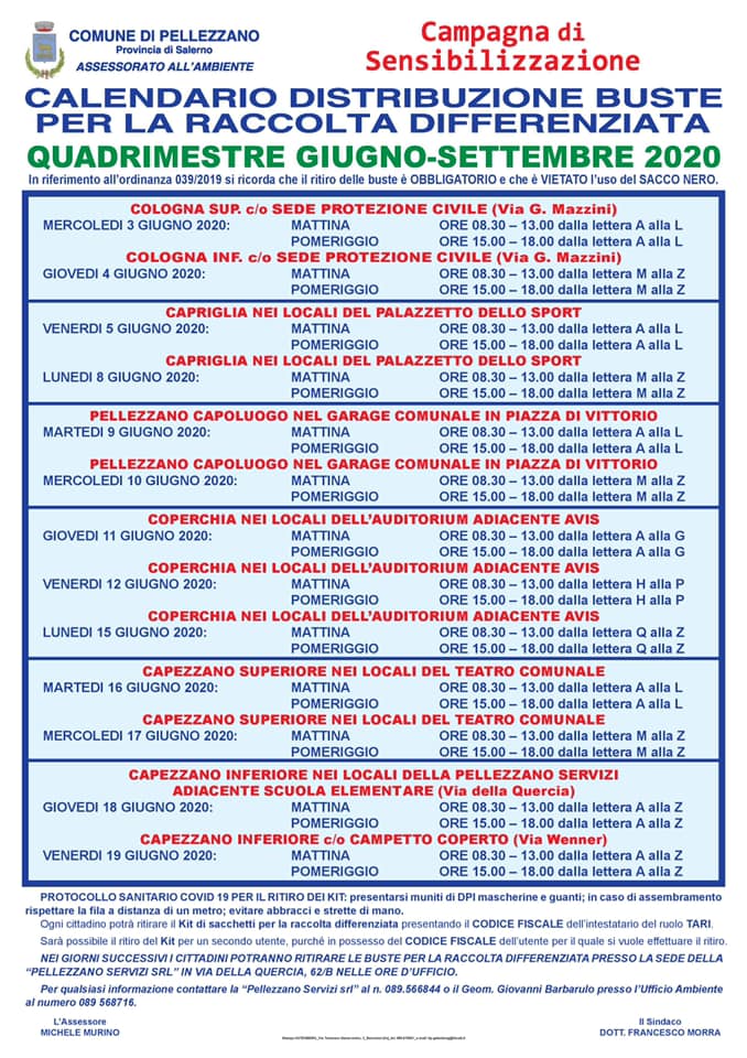 l Comune di Pellezzano ha pubblicato il calendario di distribuzione delle buste per la raccolta differenziata relativo al quadrimestre Giugno – Settembre 2020 ricordando che, in riferimento all’ordinanza num.39/2019, il ritiro delle buste è OBBLIGATORIO e che è VIETATO l’uso del SACCO NERO.