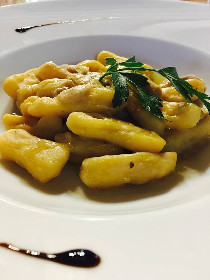 Si inizia, in perfetto clima Halloween, con Gnocchi di zucca fatti rigorosamente a mano, vellutata di ceci e funghi porcini.