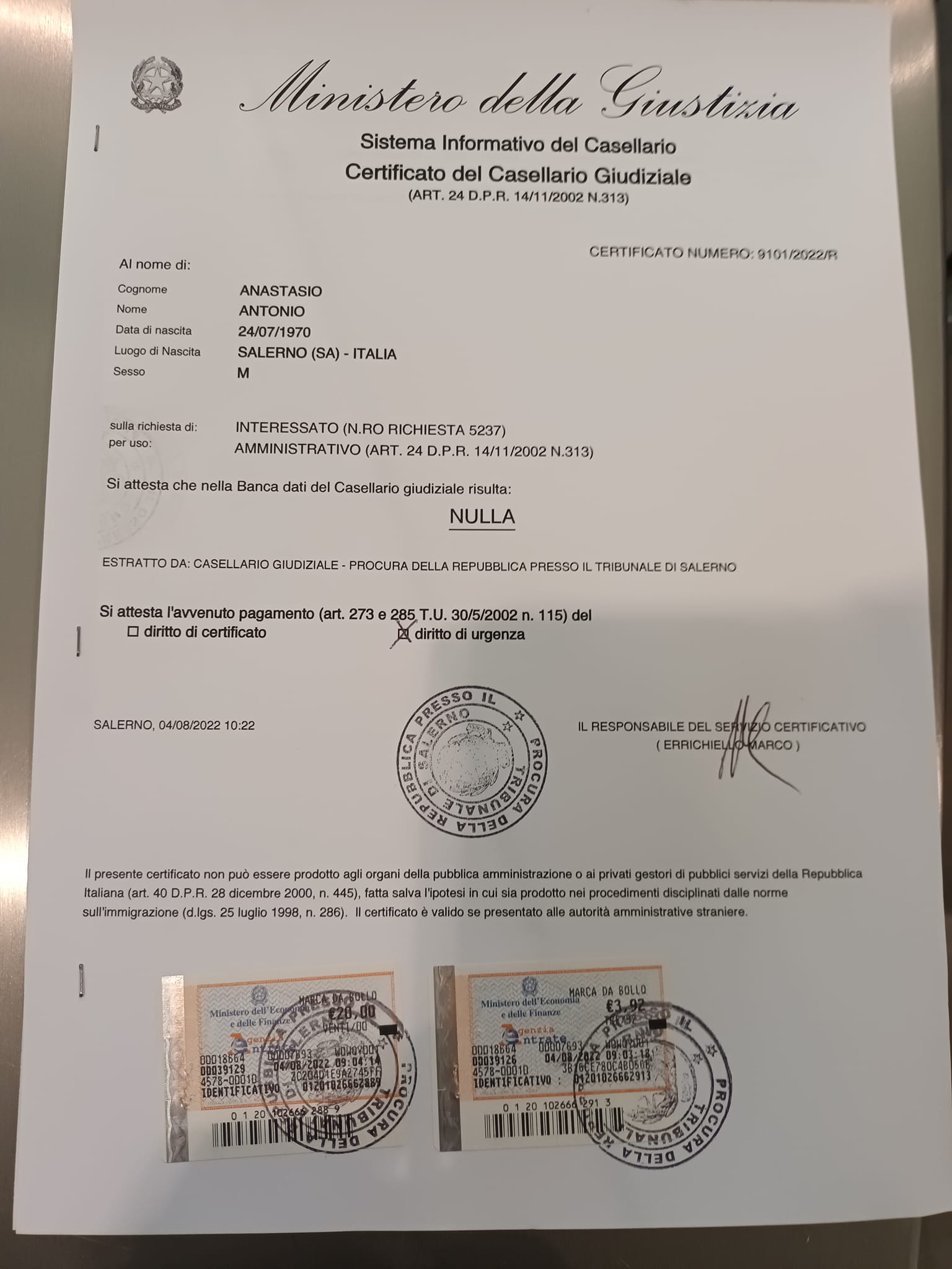 PONTECAGNANO FAIANO. ANASTASIO (FDI): “ECCO IL MIO CASELLARIO, NON RISULTA NULLA”