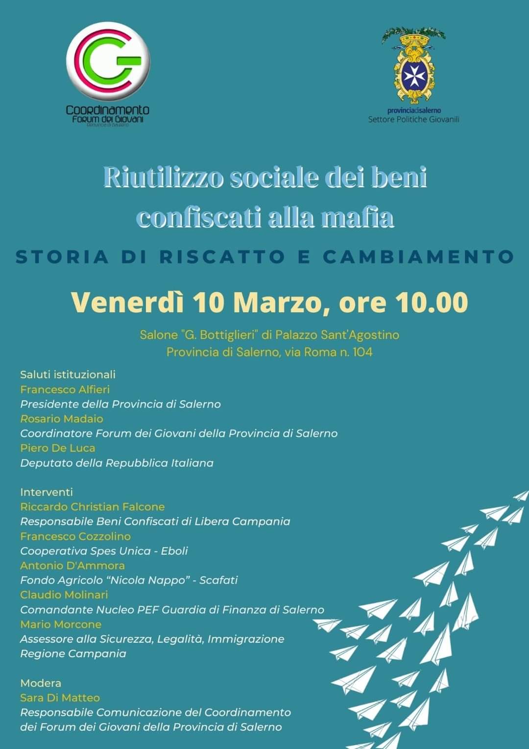 Fortemente voluto dal Vice Presidente della Provincia di Salerno Giovanni Guzzo, venerdi’ 10 Marzo, a Palazzo Sant’Agostino, a partire dalle 10:00, si terrà un incontro-dibattito dedicato al tema del riutilizzo dei beni confiscati alla mafia. Insieme ai giovani rappresentanti del Forum Provinciale con il Presidente Rosario Madaio, ci saranno il Presidente della Provincia di Salerno Franco Alfieri, il parlamentare del Partito Democratico Piero De Luca, ma anche l’assessore regionale alla sicurezza Mario Morcone, Riccardo Falcone (Responsabile Associazione Libera), Francesco Cozzolino (Cooperativa Spes), Antonio D’Ammorra (Fondo Agricolo Scafati), Claudio Molinari (Guardia di Finanza).