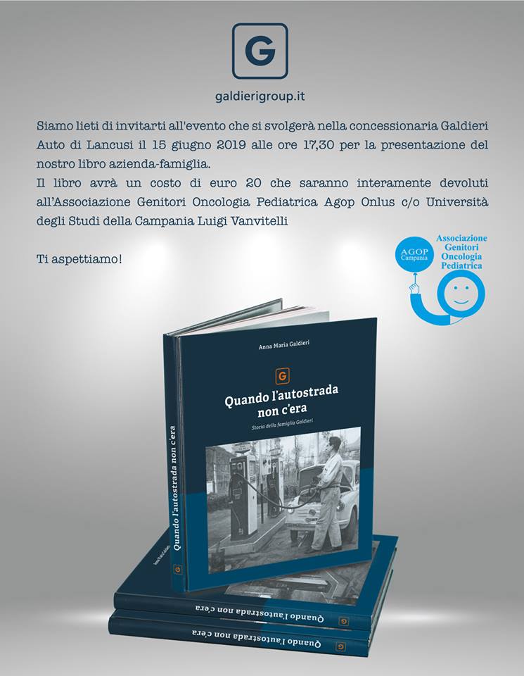 Un passo indietro nel tempo, un viaggio a ritroso negli anni della ripresa economica quando le autostrade erano ancora un miraggio, eppure gli italiani si muovevano in automobile. QUANDO L’AUTOSTRADA NON C’ERA è il titolo del libro racconto, scritto dalla Famiglia Galdieri, che sarà presentato il prossimo 15 Giugno, all’interno dei saloni della concessionaria Galdieri di Lancusi. Una testimonianza delle generazioni che si sono alternate alla guida di diverse aziende che, da anni, sono al servizio degli automobilisti. Con un nobile scopo finale: quello della raccolta fondi da destinare all’associazione Genitori Oncologia Pediatrica-