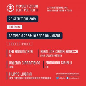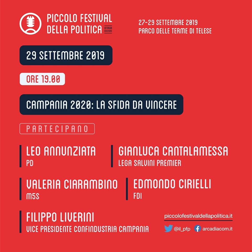 Manca solo Forza Italia all’appello ma, quella che andrà in scena questa sera a Telese Terme, nell’ambito del Piccolo Festival della Politica, è già una prima anticipazione della prossima campagna elettorale per le Regionali del 2020: a discuterne, allo stesso tavolo, il Segretario Regionale del Partito Democratico Leo Annunziata, il deputato della Lega Gianluca Cantalamessa, la portavoce in consiglio regionale del M5S Valeria Ciarambino ed il parlamentare di Fratelli d’Italia Edmondo Cirielli, appena una settimana fa indicato dal partito di Giorgia Meloni come candidato alla Presidenza della Regione Campania.