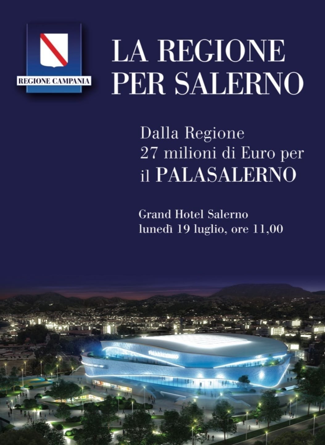 Tutti si chiedevano quando sarebbe accaduto: ora c’è la risposta, si inizia lunedi’ 19 Luglio con la presentazione dei fondi regionali per la realizzazione del Palazzetto dello Sport di Salerno. Scompare il nome del candidato sindaco Napoli, via la grafica utilizzata sino ad oggi dal Comune, ma i colori e lo stile sono quelli delle campagna elettorali di Vincenzo De Luca. Il momento è arrivato, a poco piu’ di due mesi dall’appuntamento con le urne, il Presidente della Regione, con la sua macchina organizzativa, prende in mano le redini e guida la campagna elettorale per le Comunali 2021 a Salerno. Si inizia con uno dei progetti piu’ dibattuti e controversi in città ovvero il Palazzetto dello Sport, presentato e ripresentato decine di volte: lavori avviati e poi fermati, fallimento della ditta vincitrice dell’appalto, insomma un punto dolente che non è un elemento di forza per l’attuale amministrazione. Ed allora se il dente fa male meglio toglierlo e subito: ed ecco che nella campagna elettorale di Vincenzo Napoli irrompe De Luca e conquista la scena.
